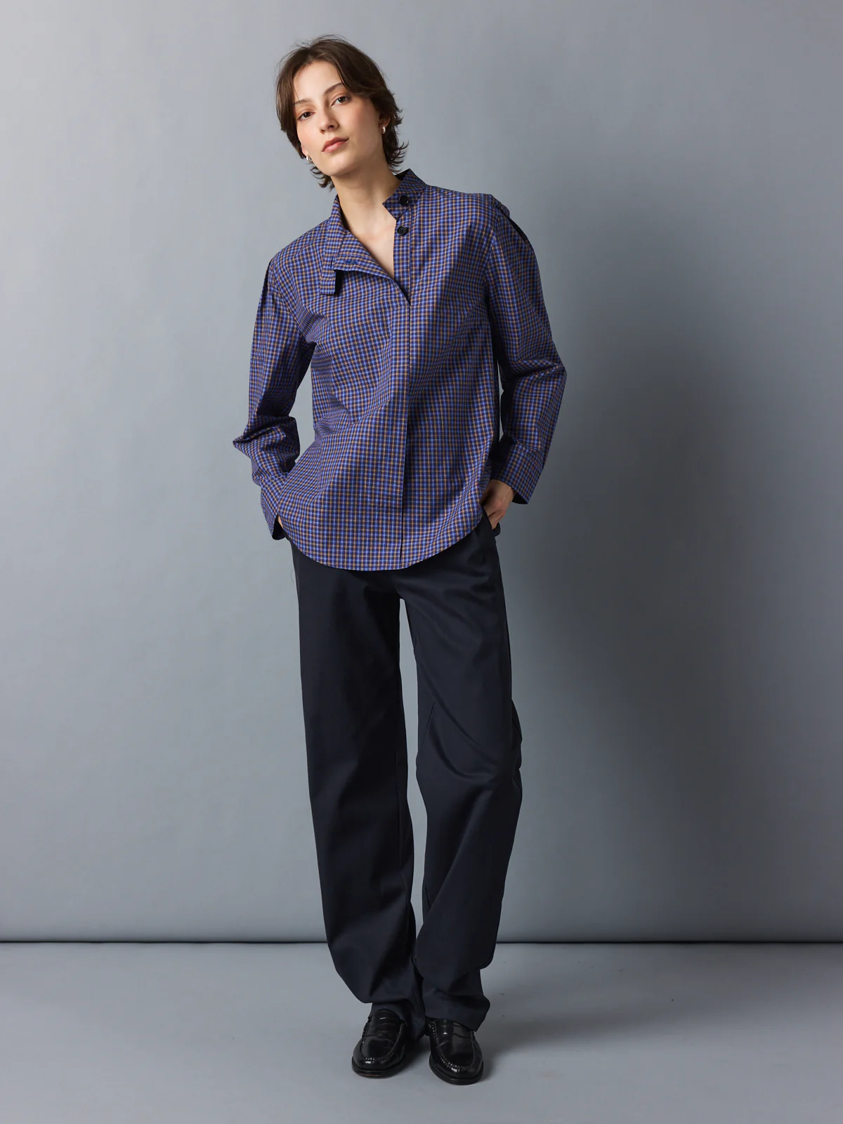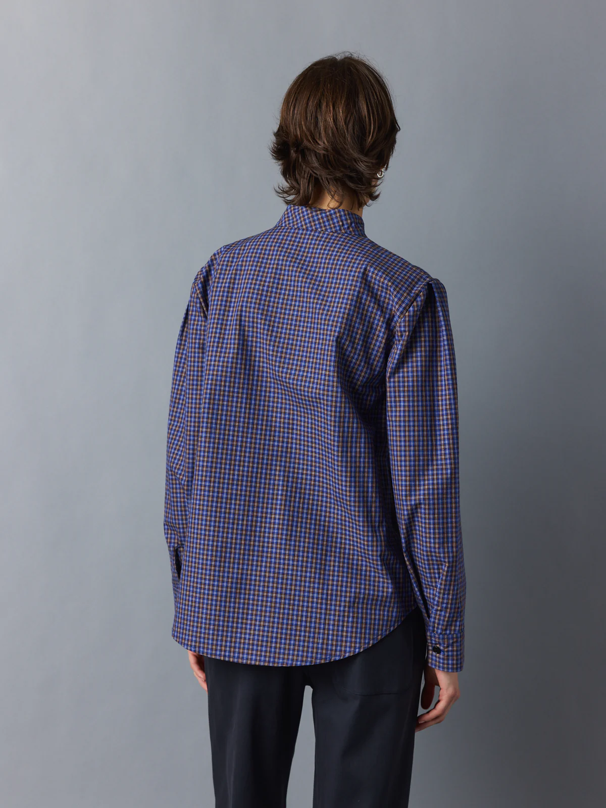 This shirt is cut from pure cotton in a small-scale check of royal blue, warm brown, and ecru, a striking but wearable combination, 100% cotton