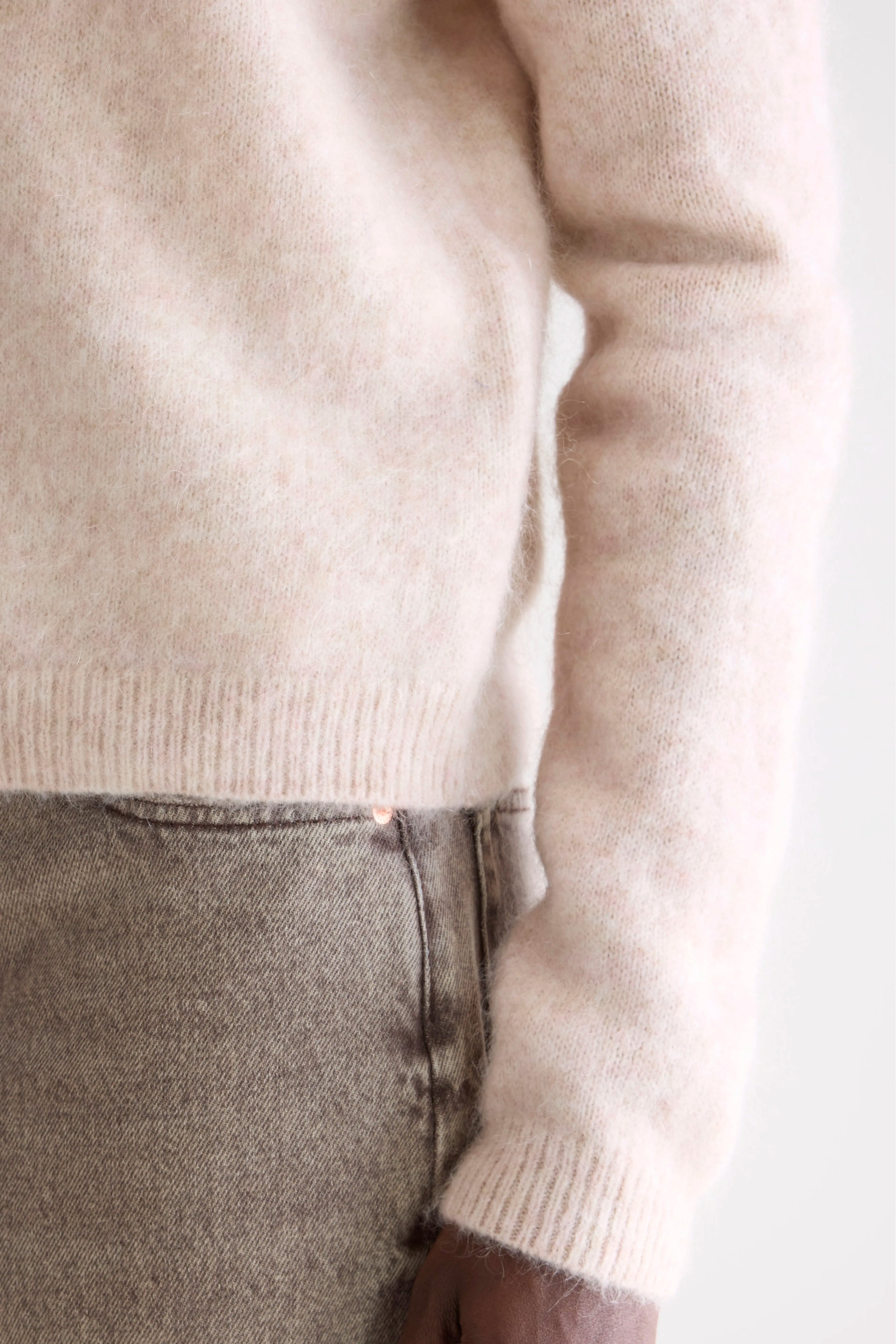 slim fit light pink knit sweater with a classic ribbed crew neck, made from a soft mohair and wool blend, 5% elastane 34% mohair 34% wool 27% polyamide